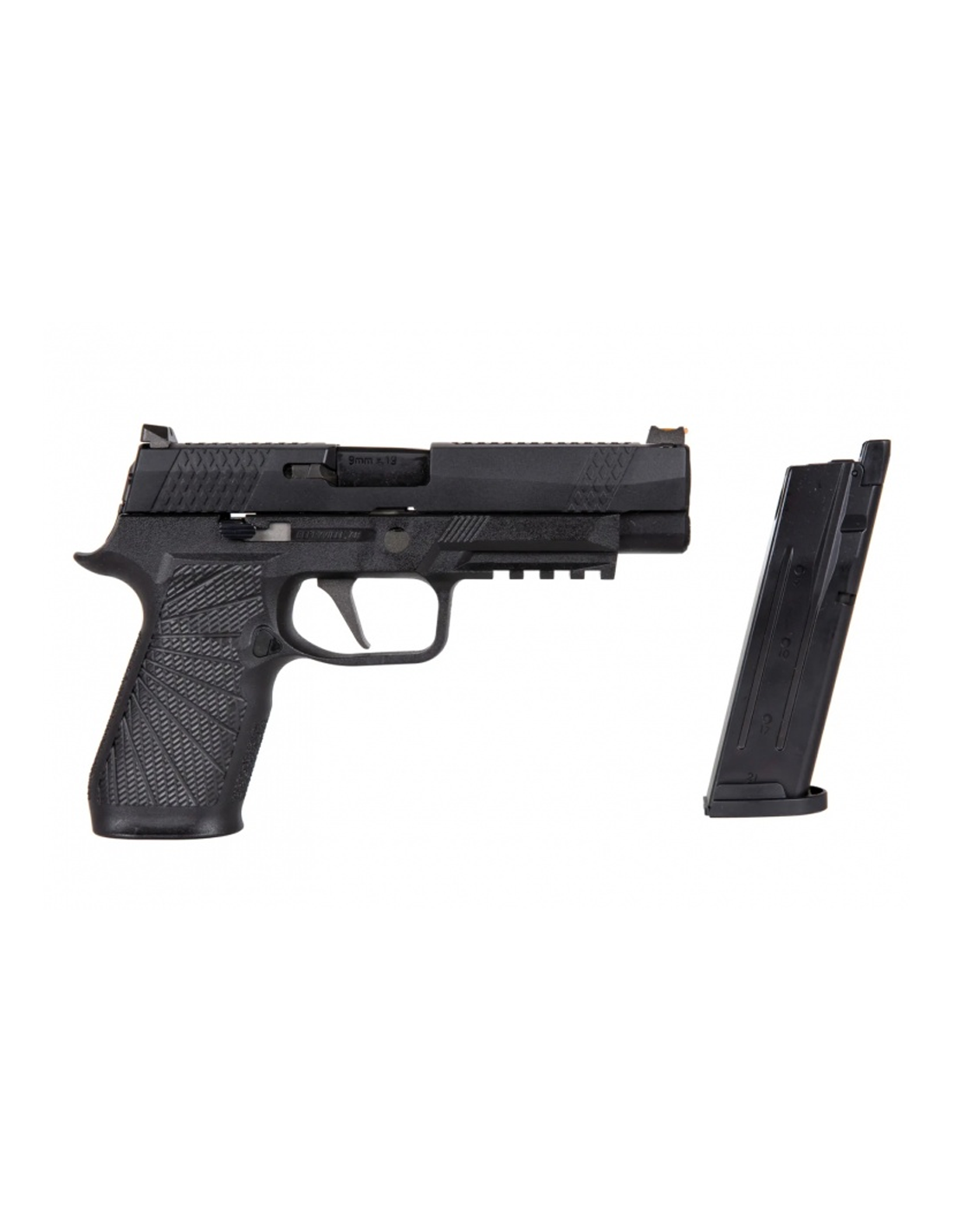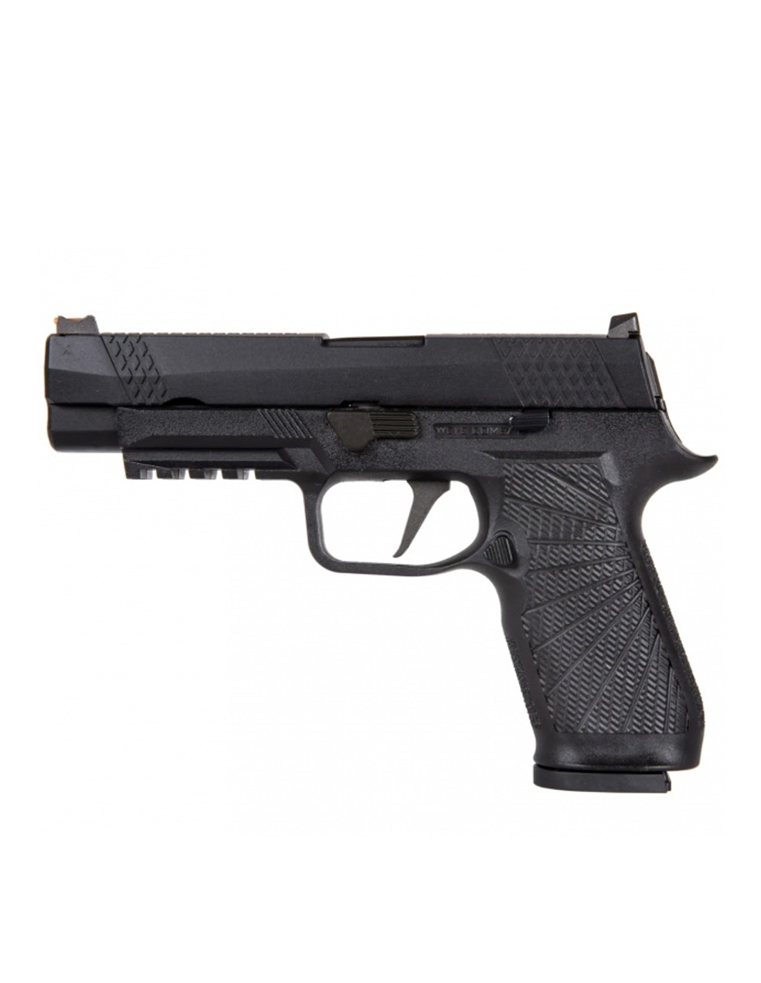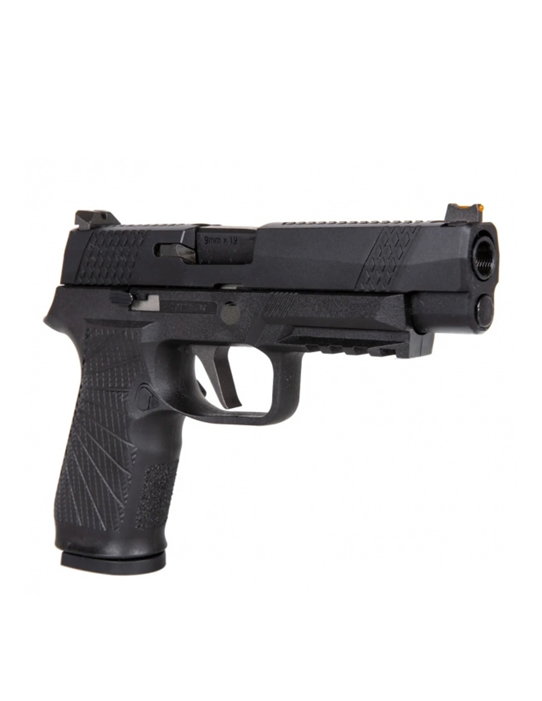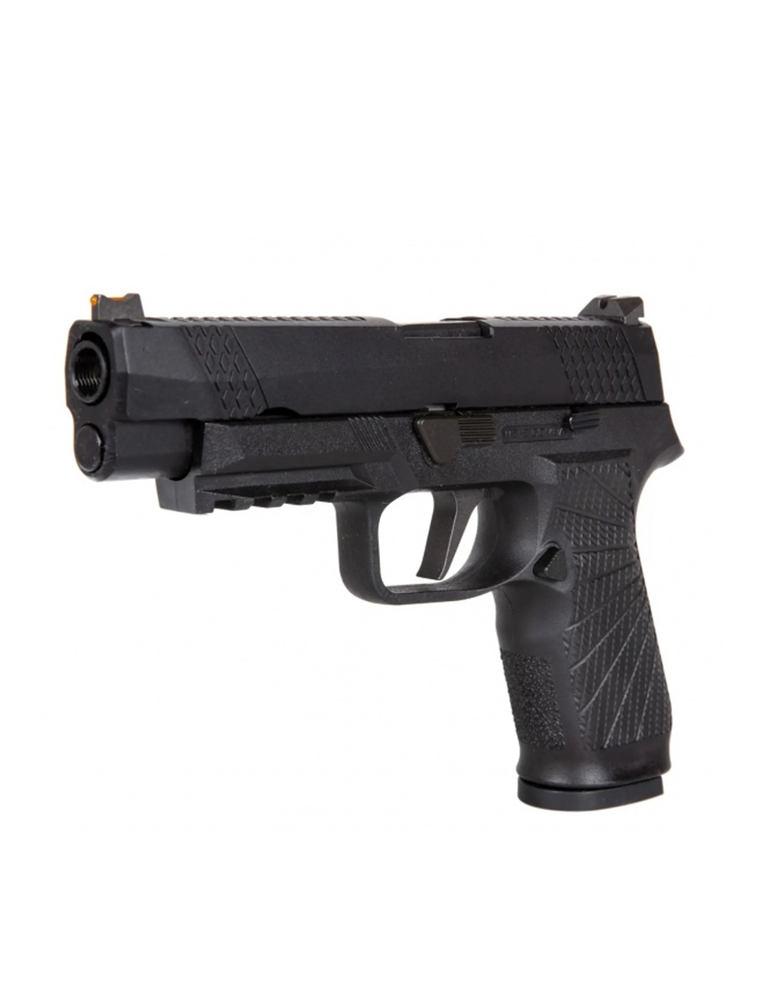 Replica vine cu un design original și distinct. Carcasa întregului pistol este fabricată dintr-un polimer durabil întărit cu nylon, având o textură aspră. Numeroasele adâncituri atât pe mâner, cât și pe corp contribuie la obținerea unei prinderi sigure. Șină RIS care permite montarea unei lanterne sau a unui laser, oferind posibilități suplimentare de personalizare și funcționalitate.